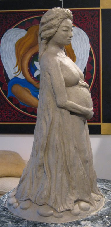To borrow from the poet Denise Levertov, “so much is in bud” as we journey further into the season of Spring. The garden is bursting with new growth and on a global scale, we are witnessing the death of old structures in preparation for giving birth to new ways of being in relationship to the other, the earth, and the Divine. Like so many of us, I feel this energy intensely and it has been organically coming forward through my artwork. The sculpture shown here, MotherEarth (part human, part tree) is the second in my maiden/mother/crone series and is nearly complete. The womb in the back spontaneously emerged much like the womb/fetus in the “Creation Illumination” that I shared with you last month (you can view the painting below). On Saturday night, in honor of Earth Day, I also attended the seasonal sweat lodge ceremony at my spiritual community, People of the Heart. It was powerfully symbolic as it occurred on the day between crucifixion and resurrection during the Easter holy days. Entering into the womb of the mother earth, I let go of old wounds that needed to die in order that I can birth anew–trust, vulnerability, and JOY amidst these challenging albeit evolutionary times.