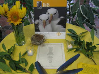 From top: 1-2. The installation in the PCC community center. 3. View from the mourning wall side, large posters of endangered species hang from the clock sign. 4. Early start on the nature mandala. 5. Altar to the direction of the East, honoring air and winged creatures. 6. Final mandala before dismantling and offering it to the earth in gratitude for the gifts we receive from her. You can see more photos at Sacred Art Studio Facebook page.