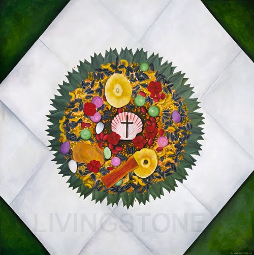 The “despacho” is an ancient ceremony performed in the Andes. These are offerings to either Pachamama (Mother Earth) or an Apus (mountain spirit). The former is distinguished by an abundance of red objects/flowers, the latter by white. They typically begin with a shell in the center to represent the feminine, a cross to represent the masculine, and Kintus (3 cocoa leaves grouped together). In the Andes, additional items might include money, food items, ribbons, alcohol, dung, or a llama fetus. These are determined by the paqo or shaman performing the ceremony which is very elaborate and includes praying, group cocoa exchange as well as music and sharing of the pipe. Overall this was a magical and mystical experience for me and words just don’t do it justice. For my painting, I went to the local market, chose items I felt would please Pachamama, and created my own despacho which I then painted as an offering. My process is one of devotion and is a prayer for the healing of the earth. Ayni, or reciprocity, is at the core of the Andean way of life and rituals like the despacho honor our relationships to the earth, the living energy, and to each other.