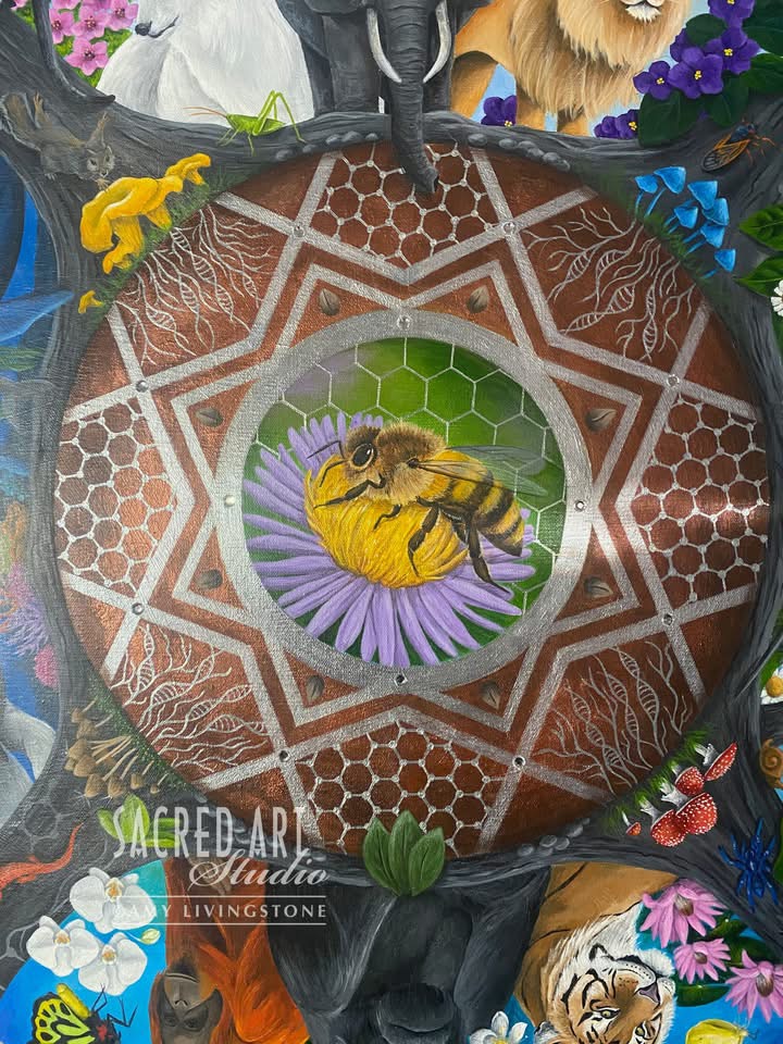 The center of the mandala, the coppery, rich soil with its underground network connecting trees. Mycorrhizal fungi play a crucial role in the below ground carbon cycle and facilitating carbon transfer between trees. You can see the silver carbon molecules in the center and up the trees to the crown. It’s fascinating and have learned so much over the years reading books by scientists and indigenous wisdom keepers who are sharing their knowledge around the awe and miracle of our forests. (Happy to share resources if you email me).