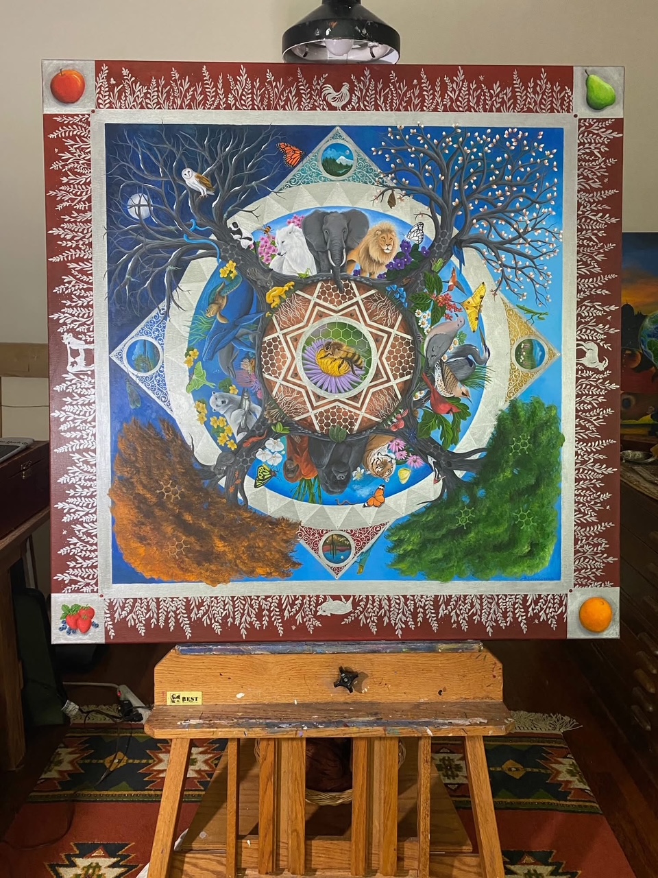 I’m excited to share that I have completed the “Kinship Mandala,” our Council of All Beings to borrow from my teacher Joanna Macy. I envisioned this piece in November of 2019 and invited friends and followers of my work to contribute: “Who do you love and would grieve if lost to the climate crisis?” Many of you responded and I bow with gratitude to you all. I put the piece aside during Covid then worked on other paintings over the years. But our kin kept calling me back to make manifest this love and beauty on their behalf. More recently, as I painted, my process became an elegy (like much of my work of late) as the current administration rolls back protections for endangered species, clean water and air, and climate, while preparing for the deforestation of public lands. Trees that caption carbon, are home to countless creatures, and allow us to breathe. There is indeed much to grieve.
