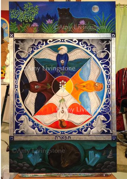 I finished Wheel of the Four Winds (30×48″) during the last week of the year and is shown here on my easel. Although I read Rabbi Gershon Winkler’s “Recovering the Shamanic in Judaism” several years ago, I didn’t actually start putting paint to canvas until January of 2013 after a long gestation period. This has been a 4-season journey and I have traveled psycho-spiritually around the medicine wheel myself this past year finding myself once again as we begin this new year in a place of visioning–around life and my work. This insight, however, did not become fully clear to me until I was coming to completion on the piece. Such is the mystery and healing power of the creative process. According to these teachings which draw from the mystical wisdom of Kabbalah: The North (eagle/Uriel guides), element of water, is the place of soul/mystery out of which we emerge. Journeying left to the West (bull/Raphael), element of earth, we experience a death or period of darkness at some point. Within this landscape we journey to South (human/Michael guides), element of fire, for cleansing and reflection. Emerging in the East (lion/Gabriel), we find ourselves at the place of balance and new beginnings. We then arrive back in the North, the place of vision. Repeating again and again until we reach a higher consciousness. Resonates with my life’s journey. How about you? There is a lot of animal medicine in this shamanic painting including the panther, the guide of the upper realm (the place of giving), and the bear, the guide for the lower realm (the place of receiving). While working on the horses pulling the chariot or merkava (medicine wheel) with silver reins, I discovered that this in the year of the Horse in Chinese Zodiac! The transliteration of the Hebrew is tifaret, the place of beauty and balance that lies in the middle on the “Tree of Life” and at the very center of the medicine wheel.